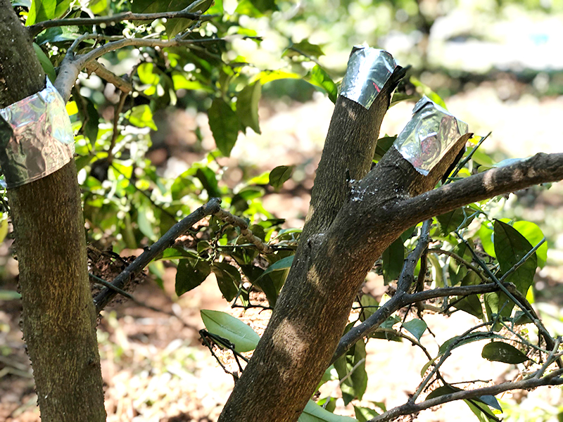 草刈りをしたあと、折られた枝を切り落として消毒薬を塗りテーピングをしました。人間と同じような手当てです。掘り返された根元には土を入れ、倒された鉄柵を起こし、鉄柱を立てて補強しました。これだけの作業は素人の私たちだけでは到底できませんので、農家さんにご指導いただきました。
